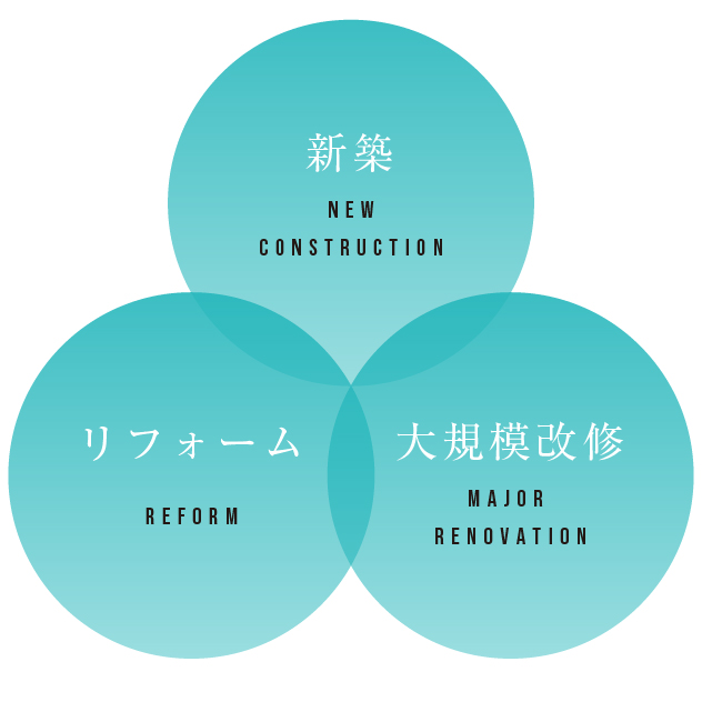 弊社が手がける建築物はジャンルを問わず、個人宅から集合住宅、オフィスや公共施設、工場まで幅広い範囲にわたっています。そのすべてに徹底されているのは、要求された空間創造に最善を尽くすこと。それぞれの物件特性やお客様の声を十分に把握した施工はもちろん新築、アフターフォローやメンテナンス・リフォーム、大規模改修まで責任を持って行います。